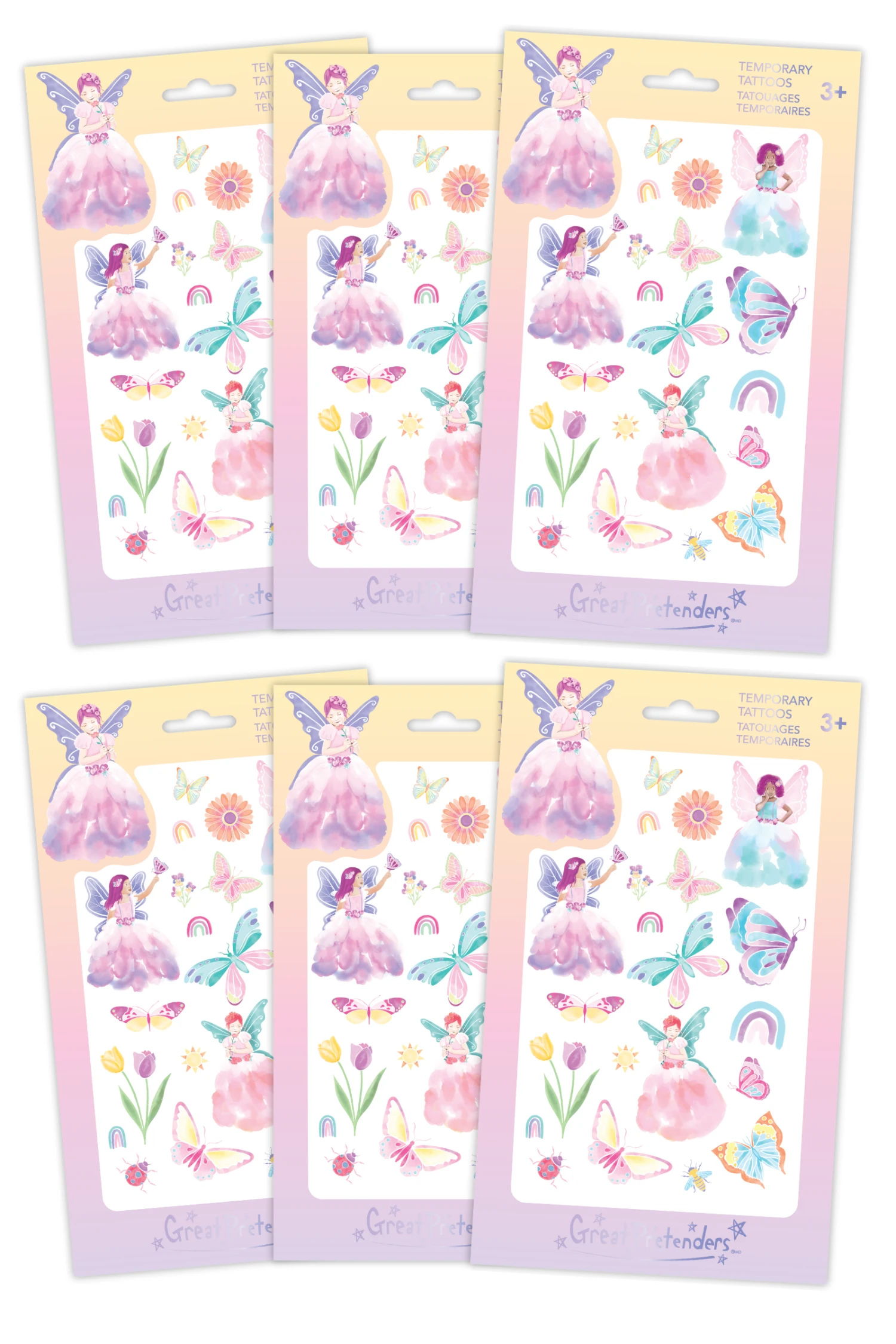 Our butterfly fairy temporary tattoos are the perfect way to make your little ones feel like a magical fairy. This sheet includes 20 hand-painted watercolour fairy tattoos. This set includes 3 magical fairies and a series of dancing butterflies, with bright and vibrant colours, these tattoos are sure to make your kids feel like they can fly!