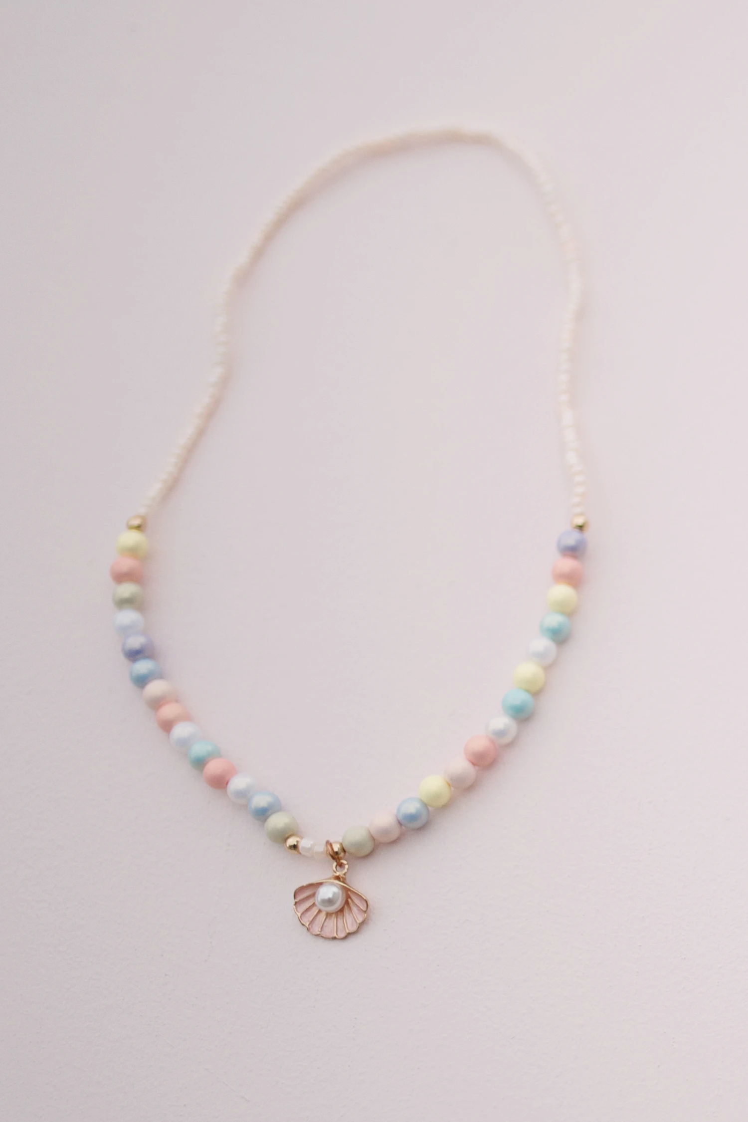 Made with a variety of pastel beads, this shell necklace is a great addition to any mermaid’s jewelry collection. This beautiful necklace is made with two styles of beads & a charming shell pendant. Be sure to check out its matching bracelet!Â