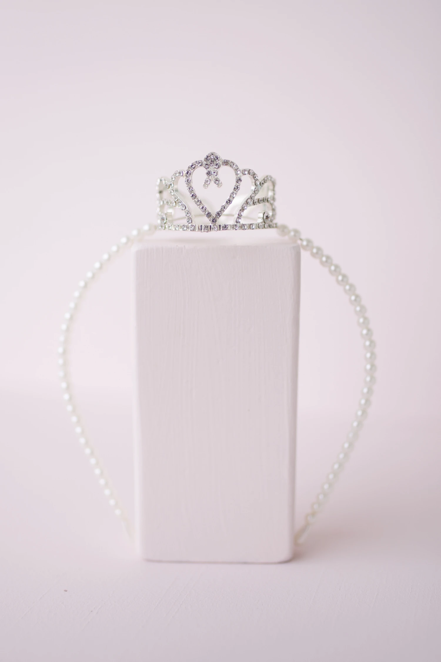 Our Boutique Pretty Petite Crown Headband is beautifully strung with white pearls & a full rhinestone crown centered on the top of the headband.