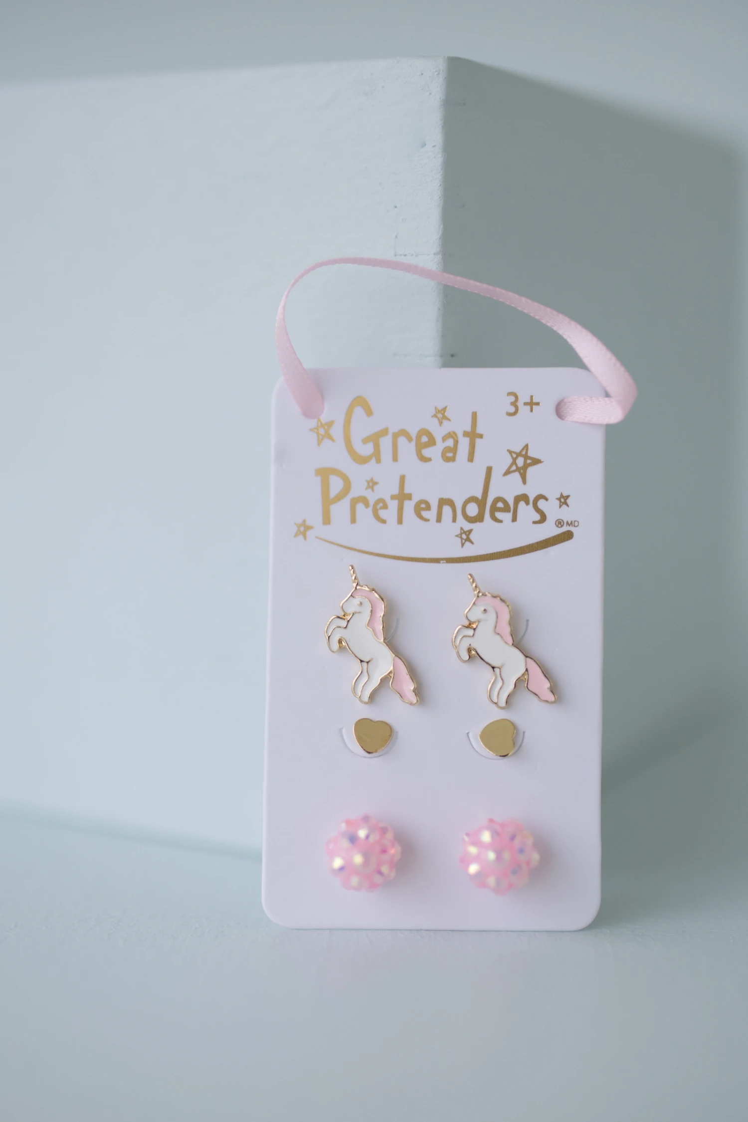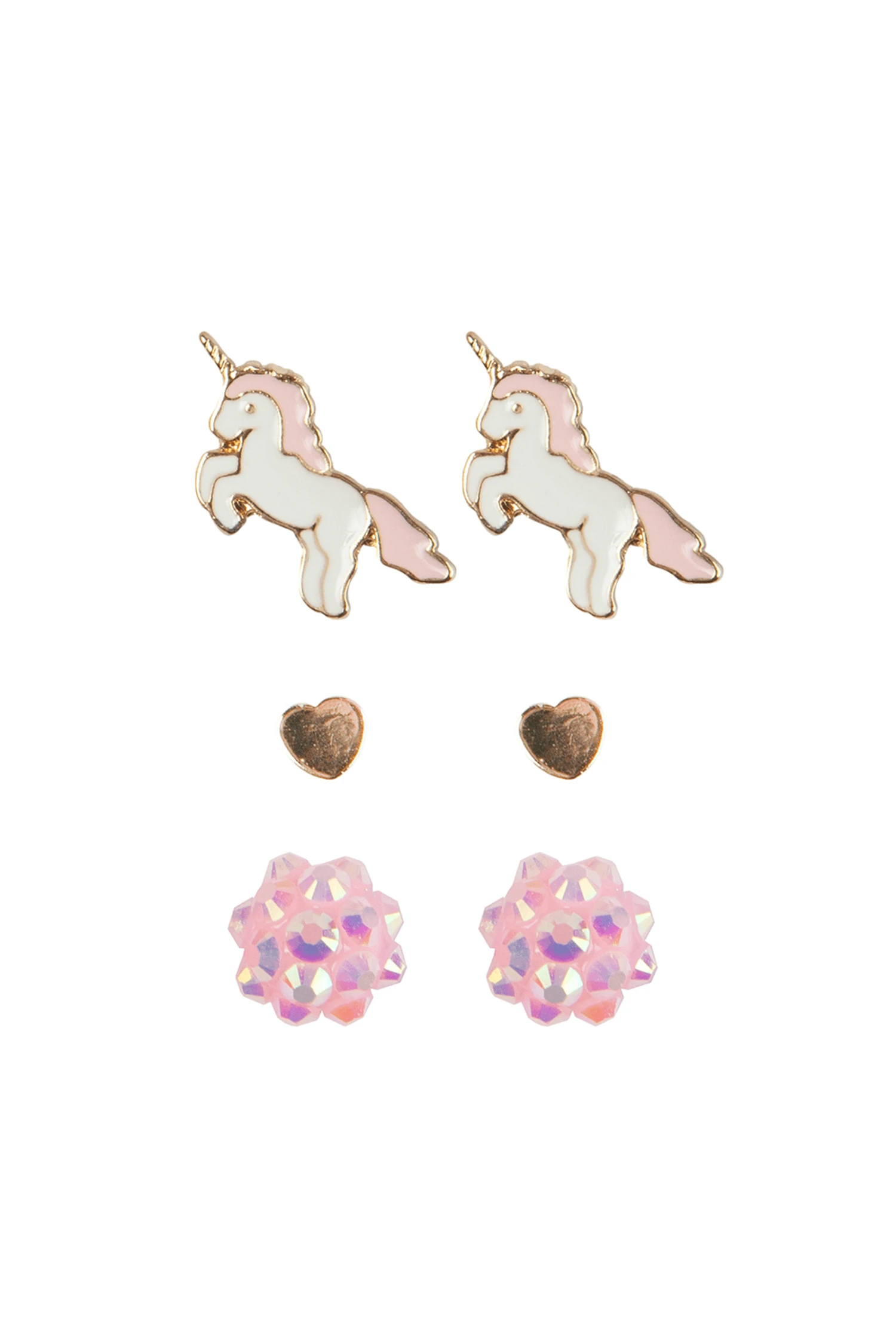 Unicorn lovers unite! This set of 3 earrings includes a pair of white and pink unicorn earrings, rose gold-coloured hearts and a pair of spunky pink studs!