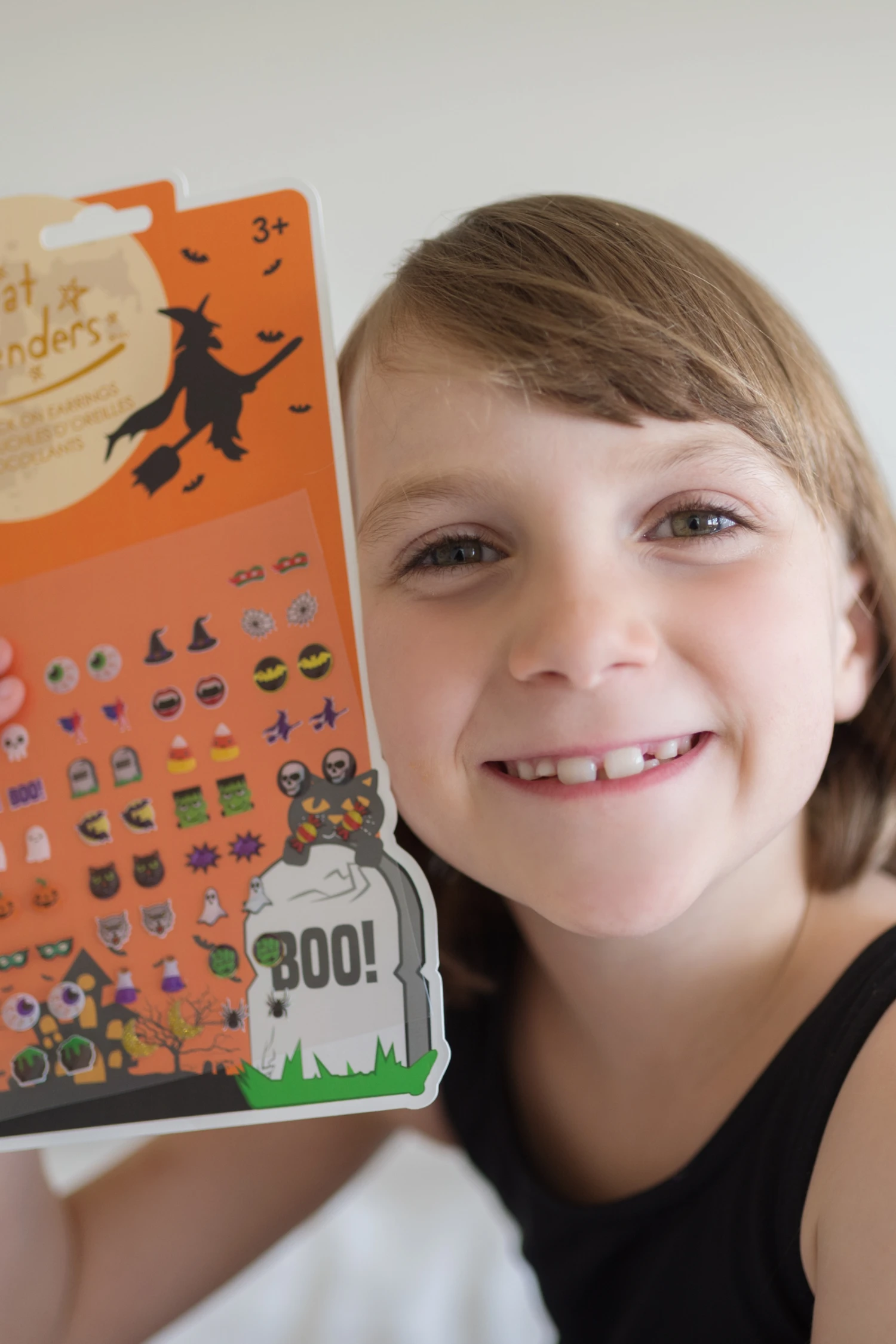 Spooky Halloween stick on earrings to compliment any costume. These stick-on earrings let you wear a new pair every day of the month. Designs include pumpkins, skulls, ghosts, and more! 30 pairs in the package.