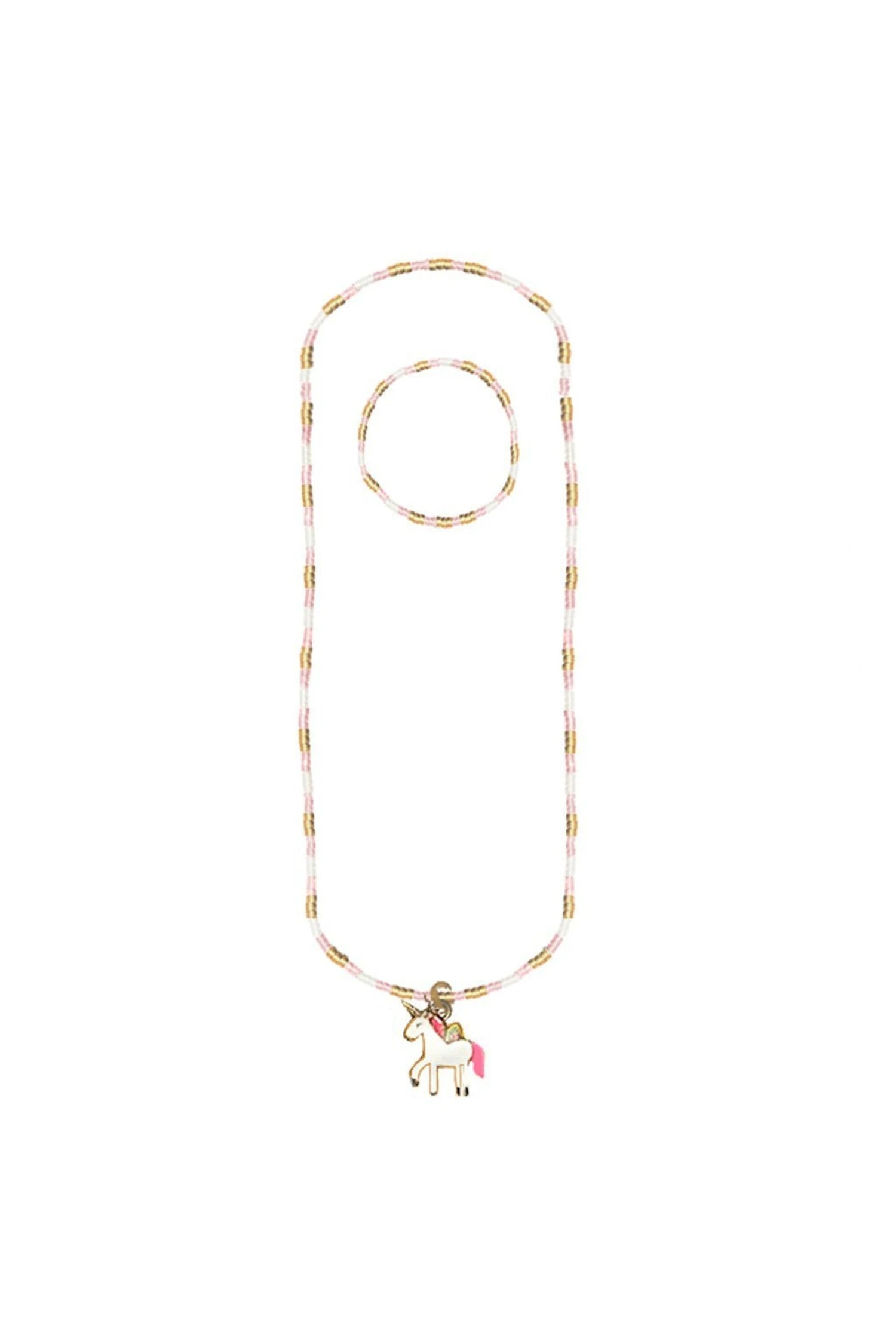 A sequence of pink, gold and white small beads make up this classy unicorn necklace. The necklaces features a glitzy magical unicorn pendant and the matching bracelet is strung with the same classy beads.