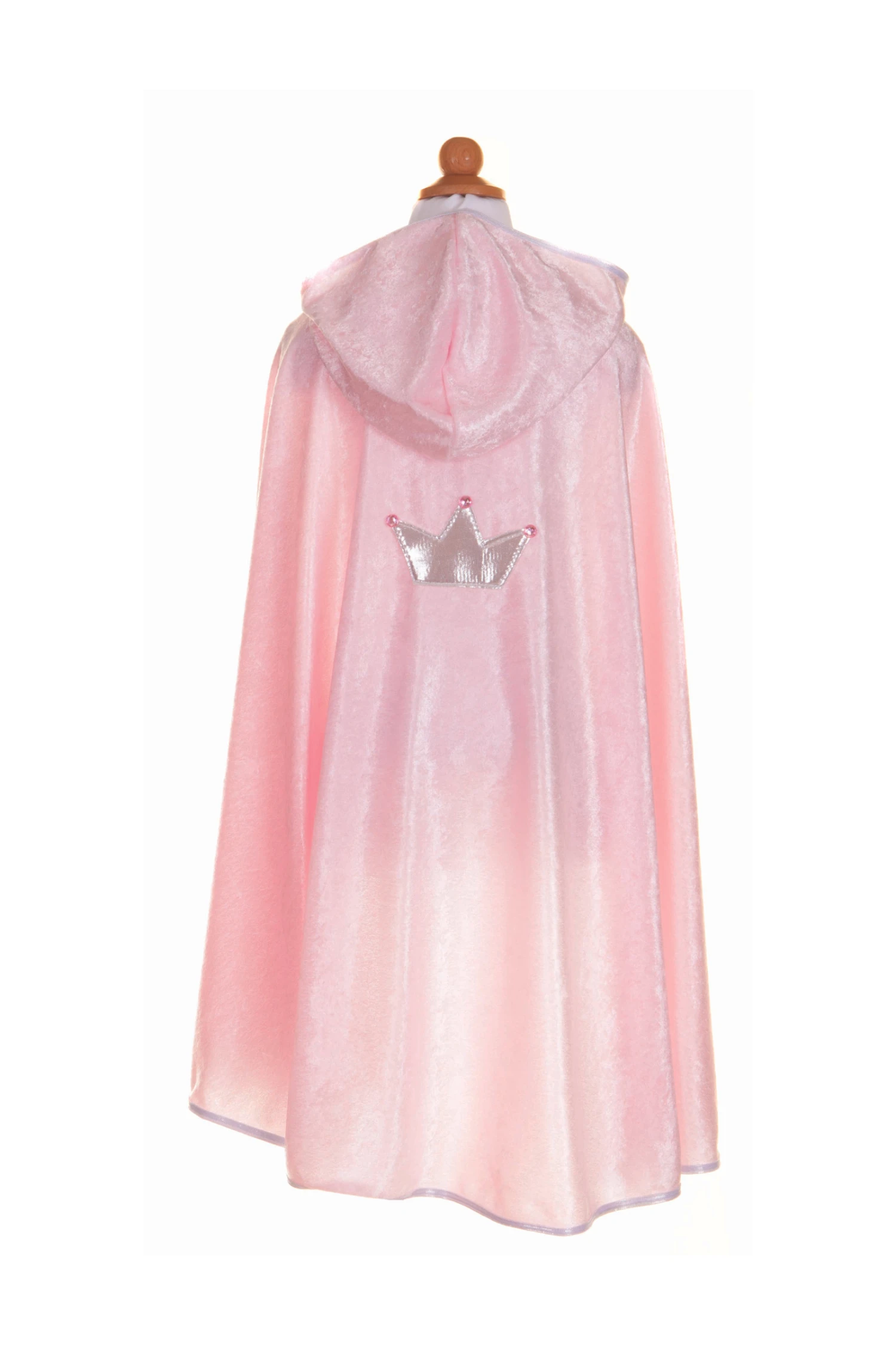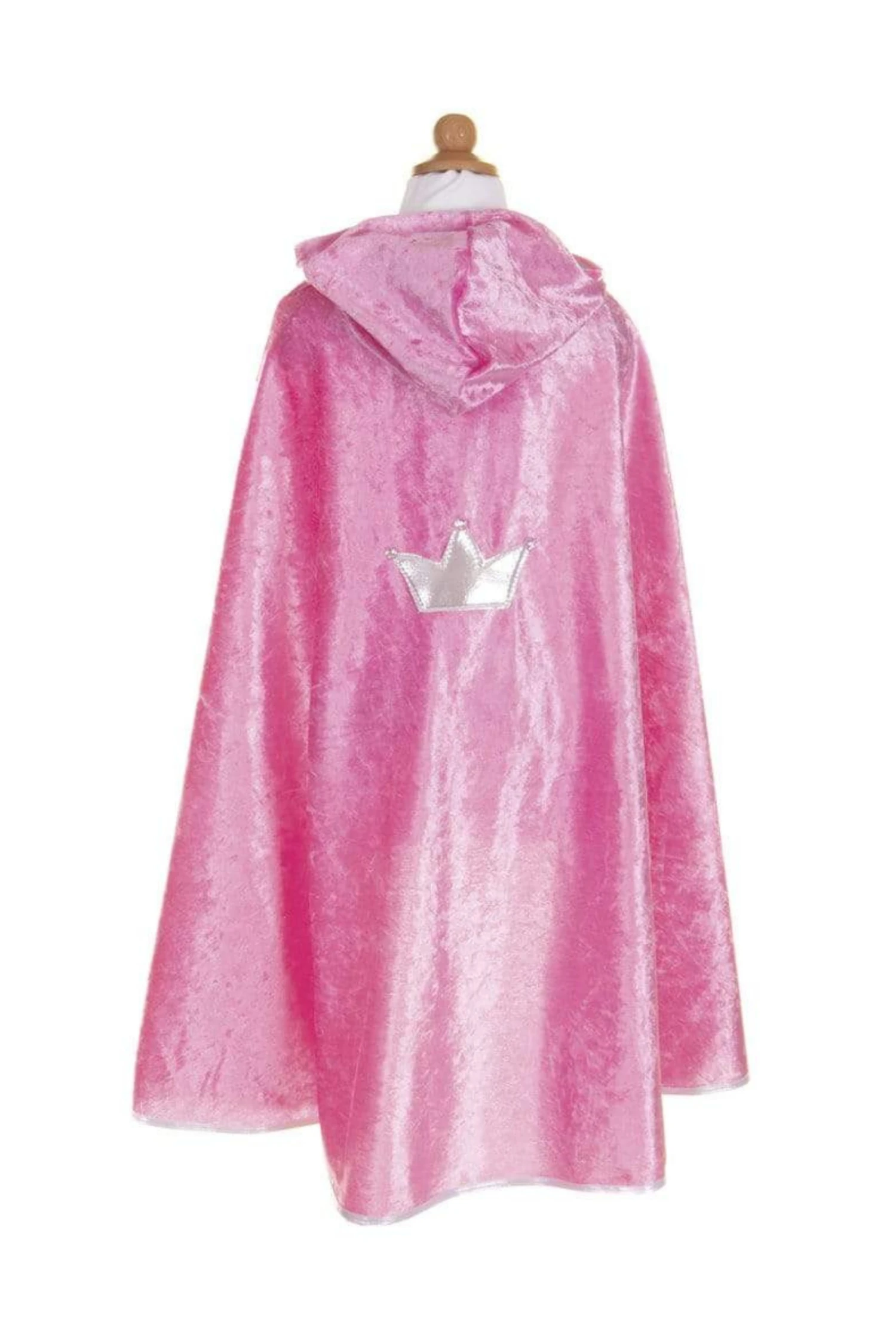 A matching cape is a perfect accessory to go with any adventure. Made with a heavy velour and accented with multifaceted gems embellishing a laminated silver liquid-knit emblem. This cape is hooded and features a Velcro neck closure with marabou feather, rose, and ribbon details. Pair with any Princess accessory – this cape goes with everything.